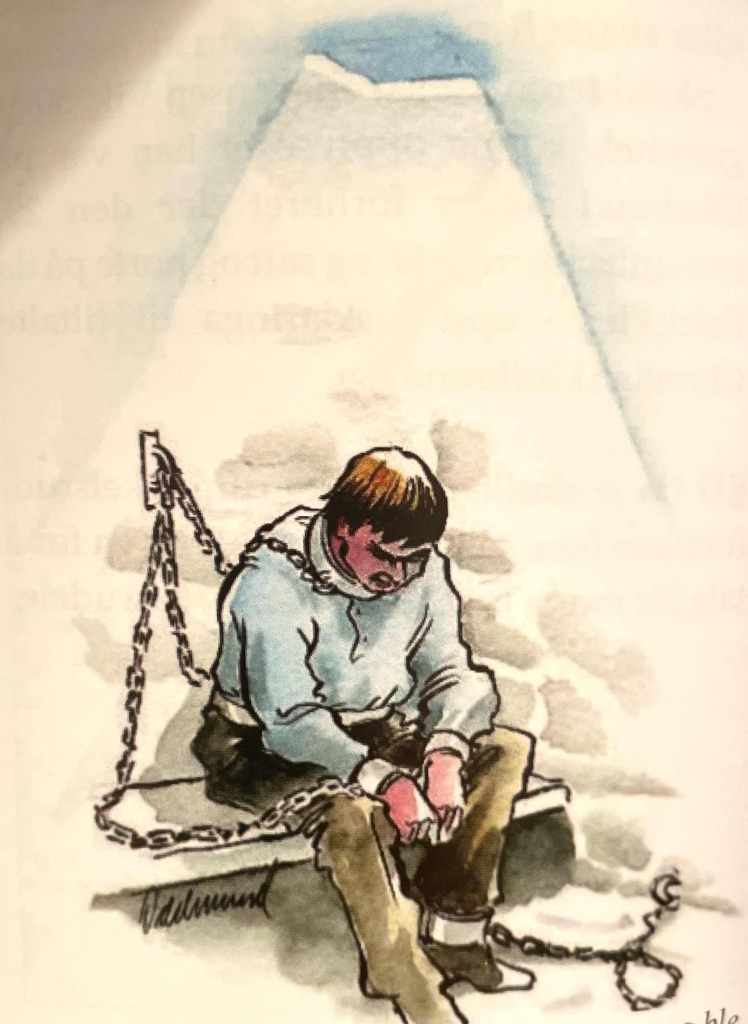 Christian ble sett på som en farlig fange, og ble lenket fast med jern fra halsen og ned til anklene. Tegning av Oddmund Mikkelsen fra Egil Enemo sin bok om Harabakkgutten.